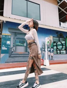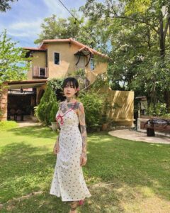 ใครจะไปคิดว่า นางฟ้ารอยสัก ที่มีรอยสักเกือบเต็มตัวจะมาใส่ชุดไทยประยุกต์ที่สำคัญชุดไทยประยุกต์ชุดนี้อย่างสวยสบายสีทองคู่กับ ผ้าถุงสีดำลายประดับเครื่องเต็มยศทั้งหัว กำไล สังวาลย์ เข็มขัด โดยรวมแล้วออกมาดีมาก ๆ ไม่แปลกที่แฟนคลับก็จะคิดเหมือนเรา มันเป็นภาพที่ดูขัดแย้งกันแต่มันก็ลงตัว จนอยากเห็นน้องแต่ง ชุดไทย แบบนี้อีกในเวอร์ชัน แบบออเจ้าหน้าจะทำให้ เป็นเซต ถ่ายแบบ ที่แปลกตาที่สุดเศษ หนึ่ง
